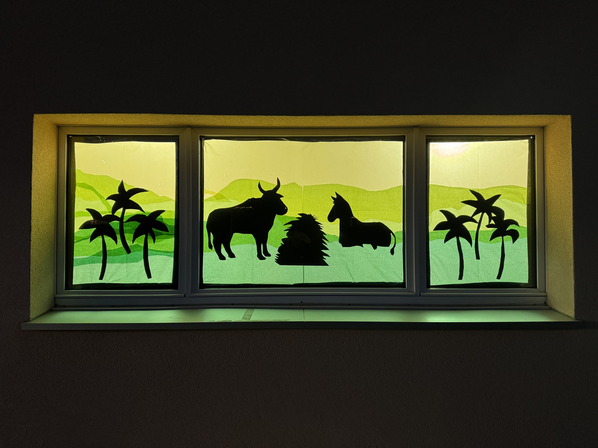 Die farbigen Adventsfenster der Stufe 1/2 lassen das Schulhaus Alpenweg wunderbar leuchten und sorgen für eine stimmungsvolle Adventszeit.